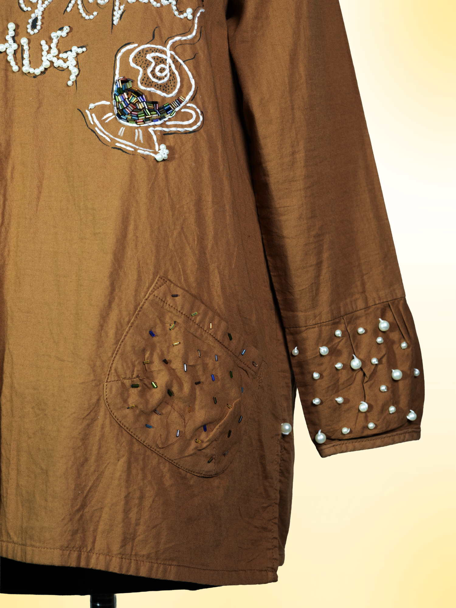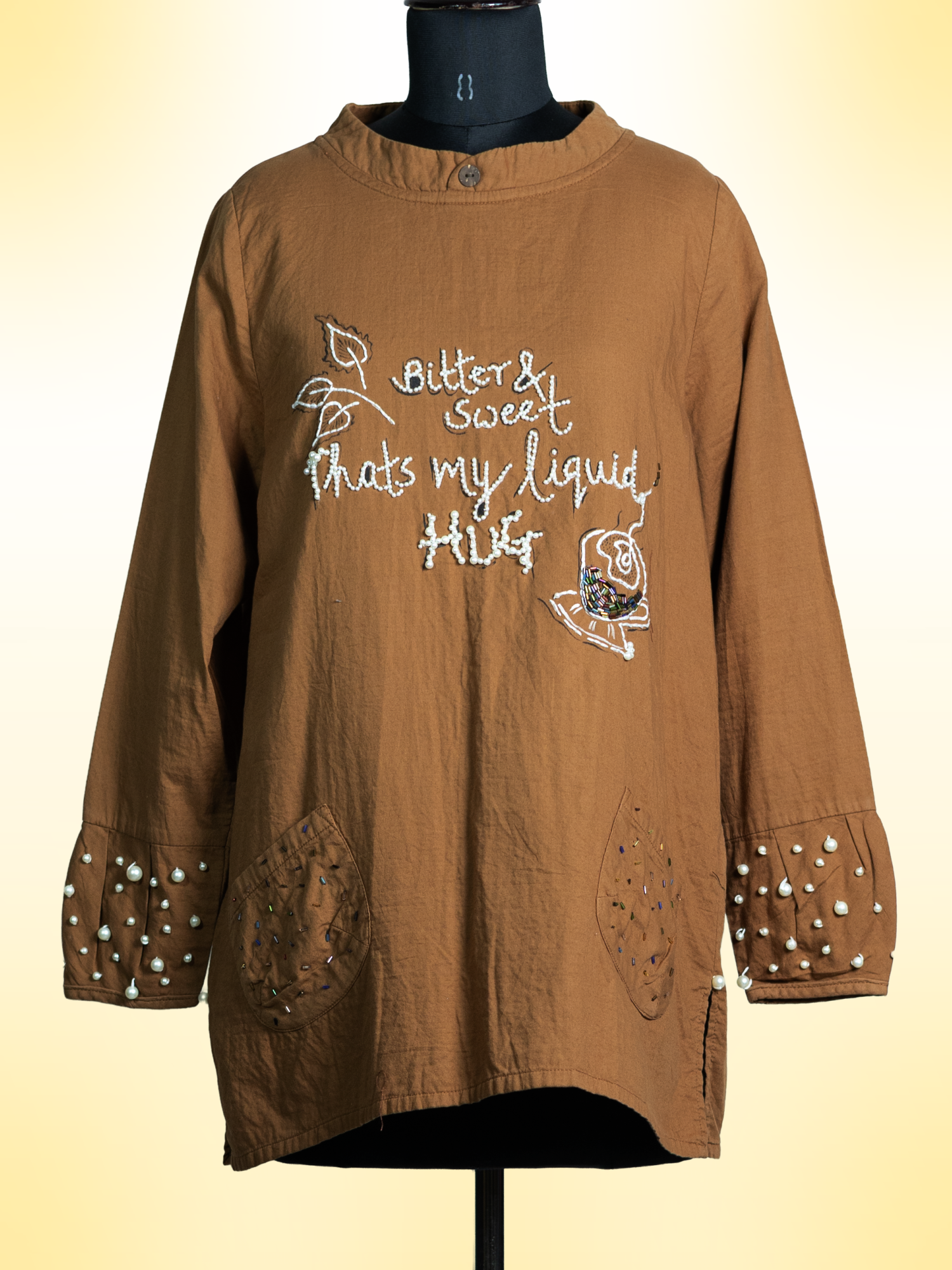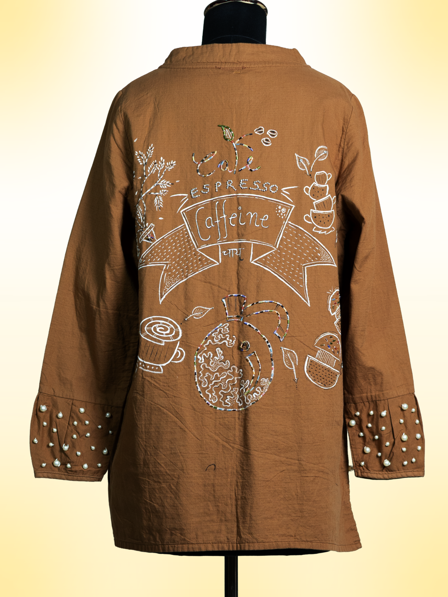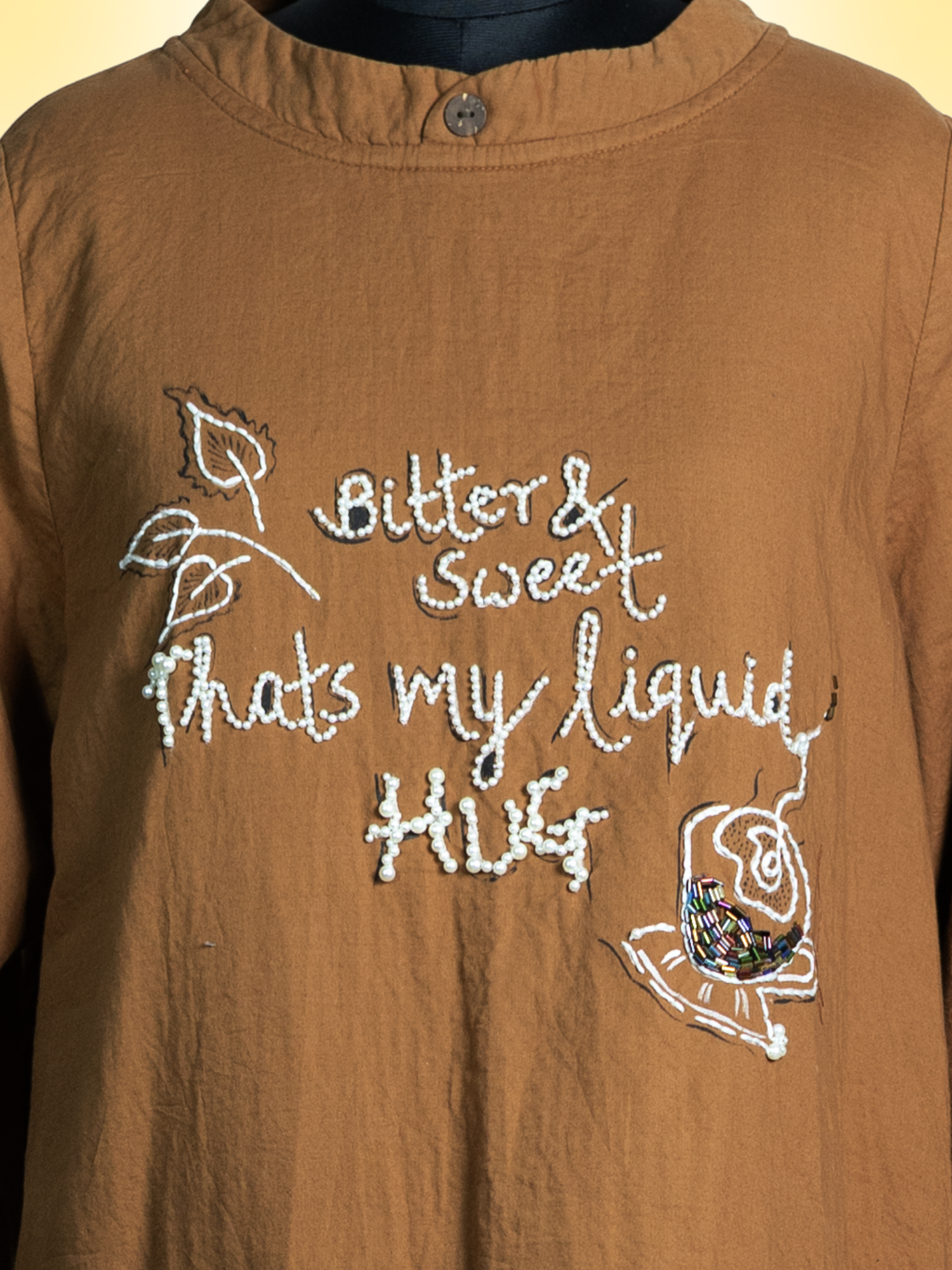 Infused with the warmth and vibrance of The Caffeine Evenings Edition, this handcrafted cotton top blends hand painting, intricate hand embroidery, and delicate bead detailing to create a piece that’s as soulful and comforting as your favorite evening brew.