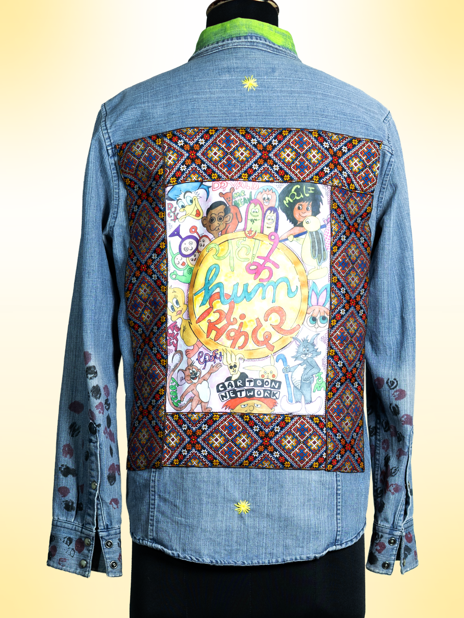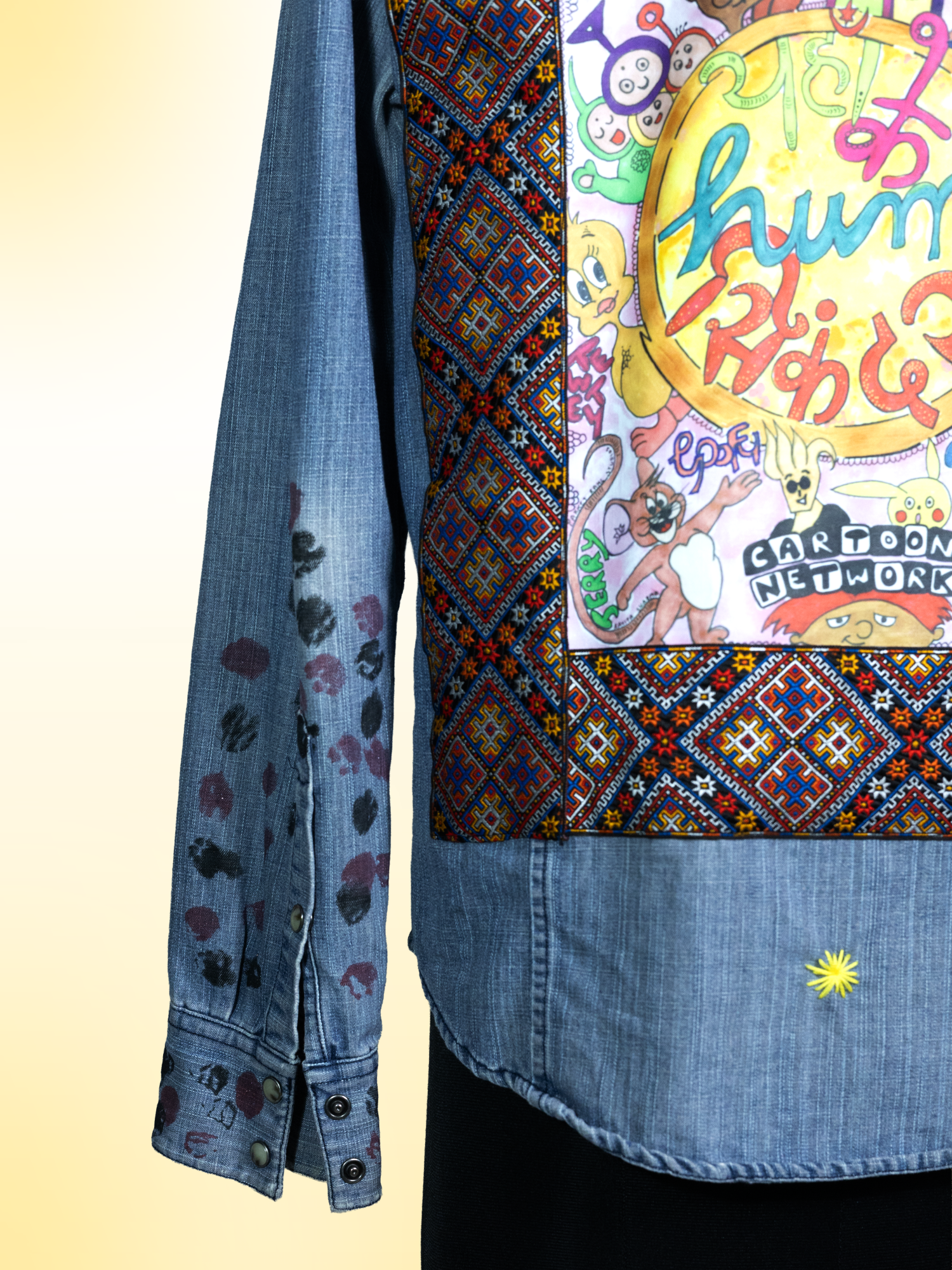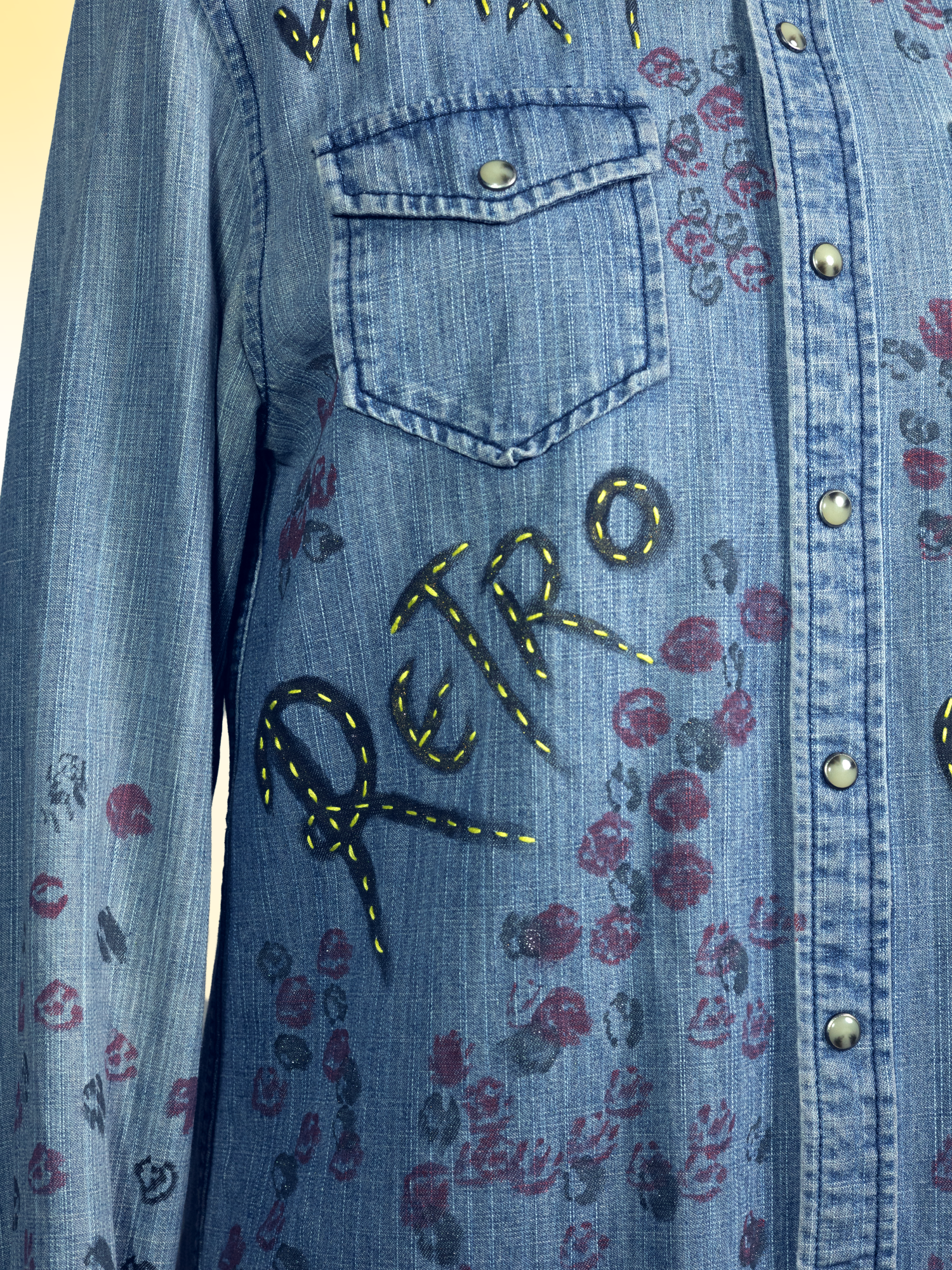Inspired by the spirit of The Retro Doodles, this handcrafted denim shirt blends artisanal details to create a one-of-a-kind piece of wearable art.