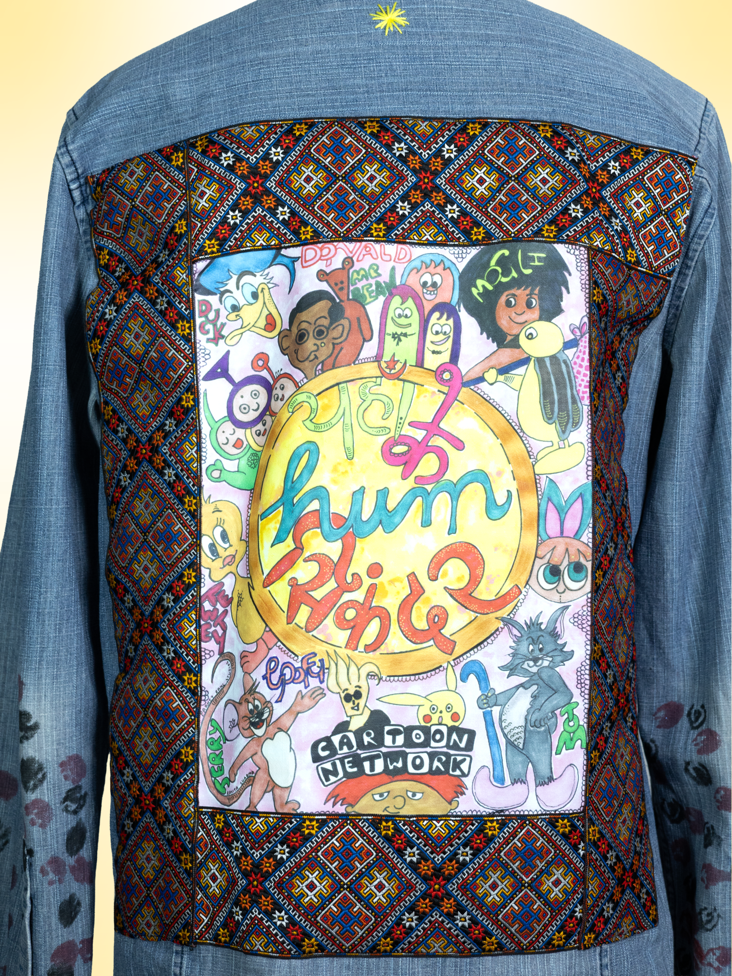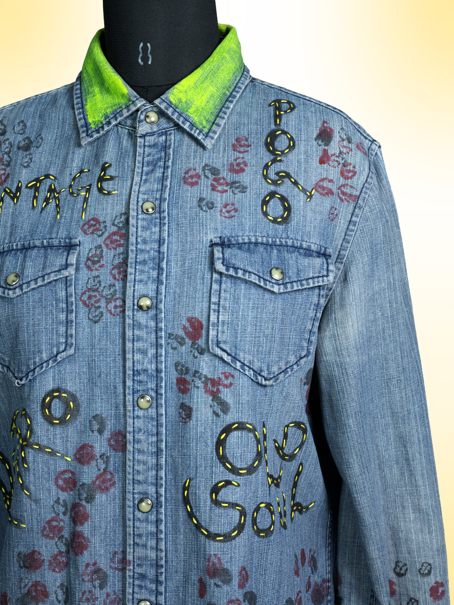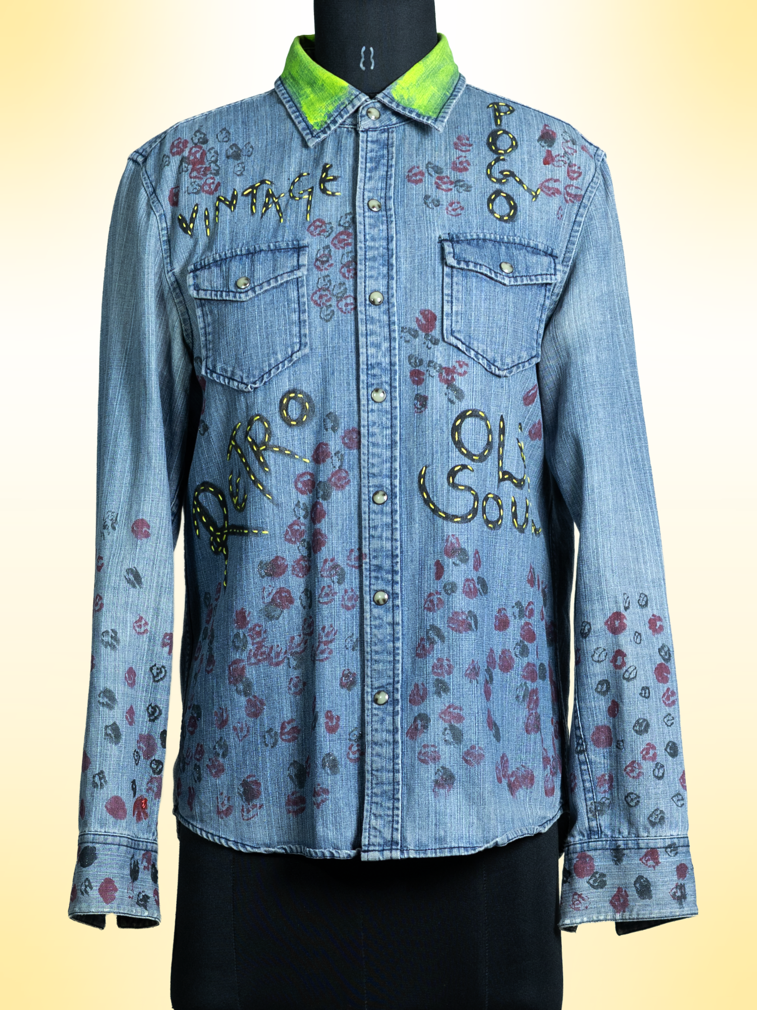 Inspired by the spirit of The Retro Doodles, this handcrafted denim shirt blends artisanal details to create a one-of-a-kind piece of wearable art.
