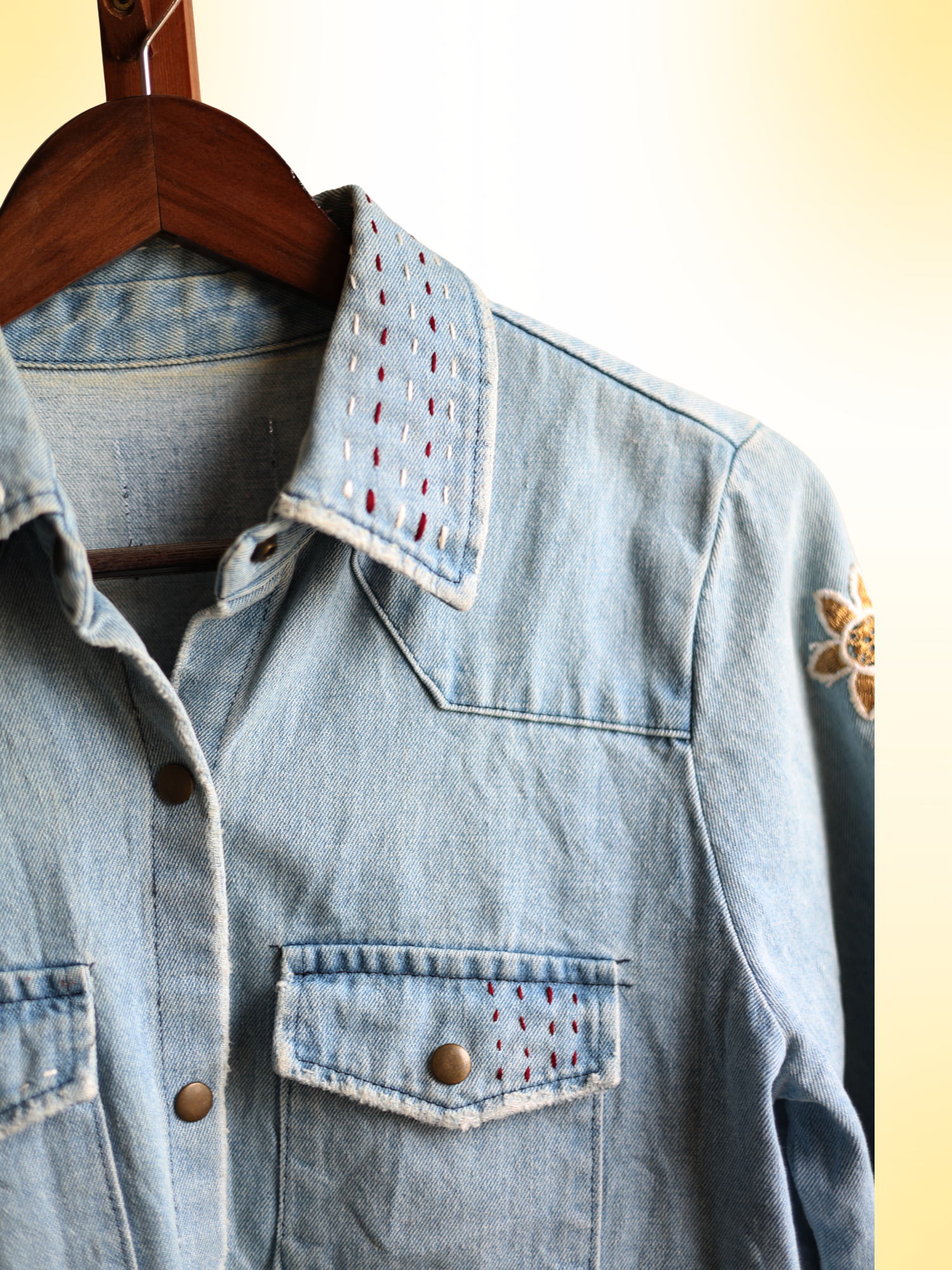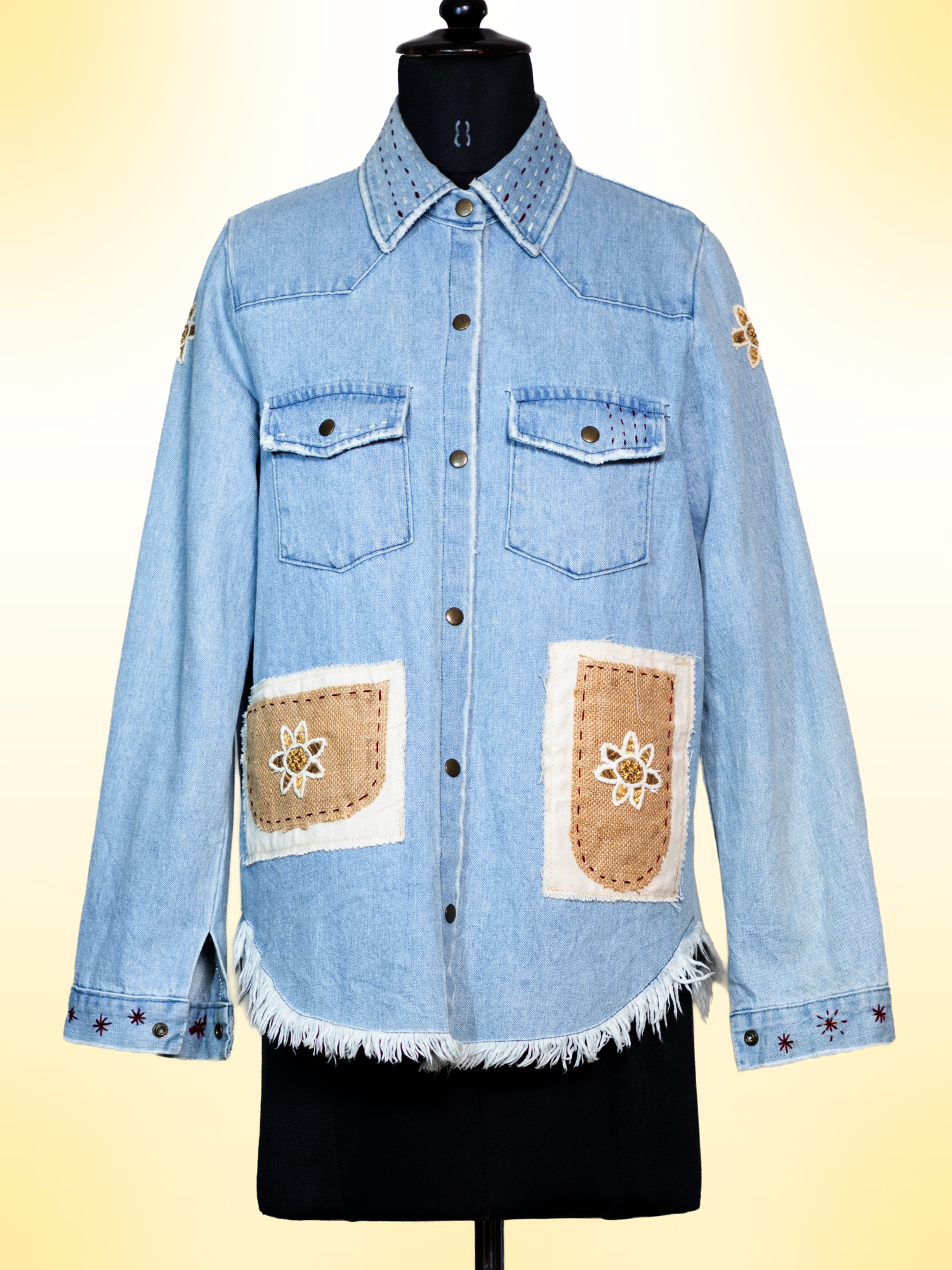 Inspired by the spirit of endless journeys, this handcrafted denim jacket from The Wandersoul Edition is a tribute to free souls who find beauty in exploration. It blends patchwork artistry and hand embroidery to create a statement piece that’s both rugged and poetic.